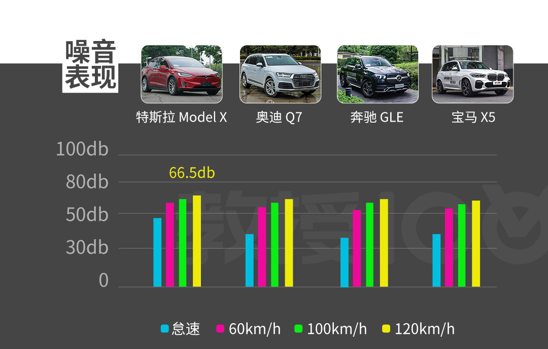 长途行驶所需要的静谧性和平顺性就不用教授多说了,Model X作为一辆纯电动车,大家看我们实测的数据就一目了然,基本是跑120km/h的隔音跟跑80km/h差不多,噪音不会影响车内的交谈和活动。
