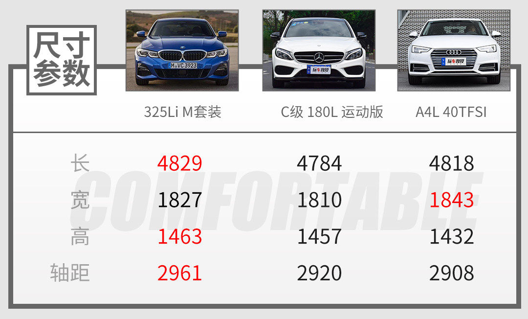 最后是车身尺寸,这一代3系长轴距版本的车型轴距已经去到了2961mm,车身已经去到4829mm,是“34C”里面最长的,这样开起来的车身姿态肯定是没有标轴版本那么紧凑,这也意味着后排有更好的空间表现,再配合柔软的座椅,所以如果是跑长途,3系的舒适性是更有优势。