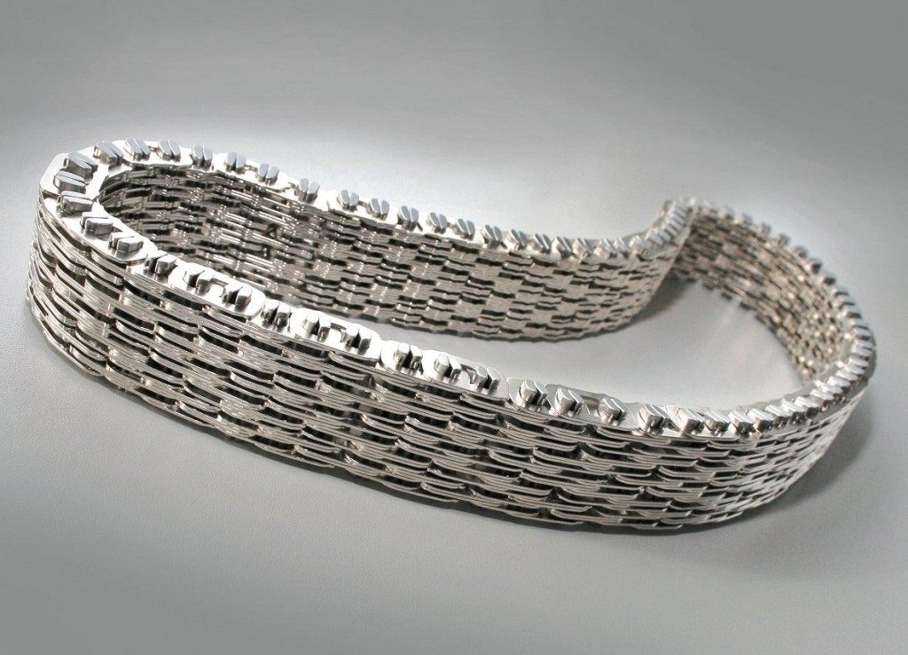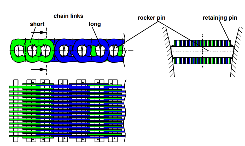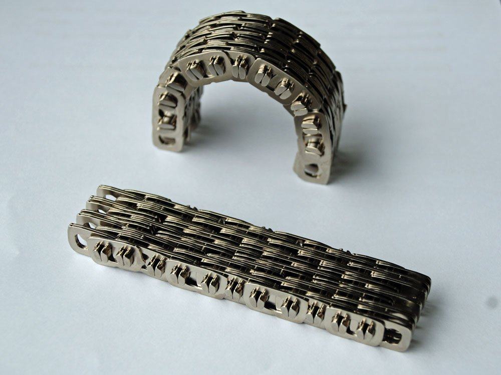 链式传动带看起来复杂,其实就和自行车的链条差不多,只不过这个链条是由1000多个扁环节链组成的。