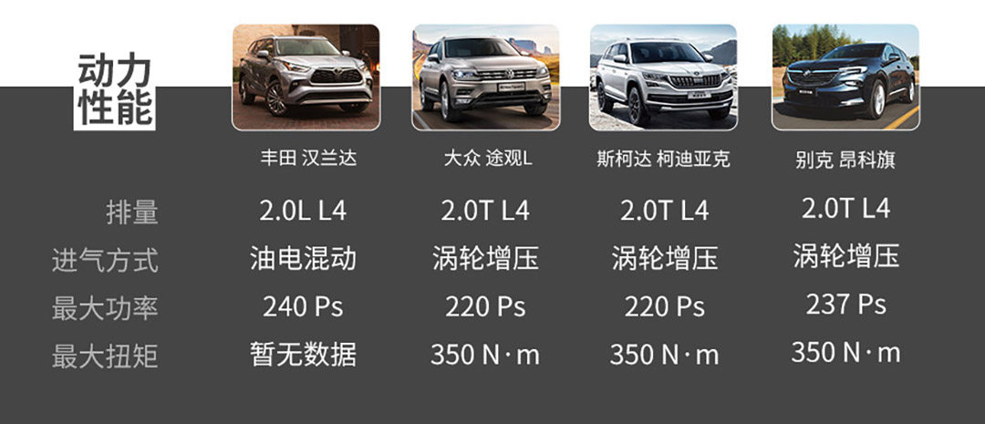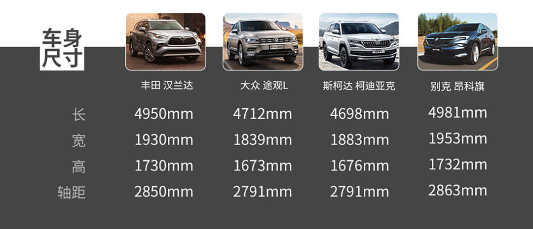 虽然汉兰达定位为中型SUV,但由于市场上合资品牌SUV售价屡创新“低”,20万级的汉兰达除了要面对更便宜的欧洲对手,甚至要警惕来自美国的中大型SUV的挑战,可以说是“压力山大”。接下来教授将会把第四代汉兰达与大众途观L、斯柯达柯迪亚克以及新近上市的中大型SUV别克昂科旗放到一起进行从外观、内饰、空间与动力系统全方面的对比,看看第四代的汉兰达在这几款实力对手面前是否具有优势。