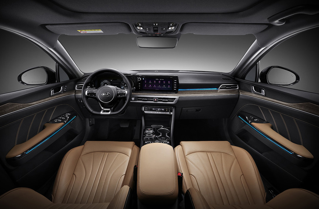 内饰方面,全新K5使用贯穿式连屏设计,同时在中控台中部加入了大量的木纹装饰件,看起来更加有质感,同时很多细节使用撞色装饰条点缀,让车厢看起来既高级,又不失精致。
