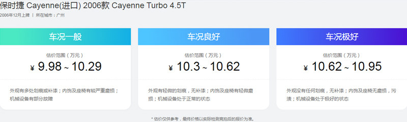 没错,加上一系列的手续费用大概10万元出头,就能通过二手车渠道购入一辆06年的保时捷Cayenne,但是如果算上养车费用再与一辆10万元价位的全新同级别SUV相比,Cayenne就没有多大的性价比优势了。