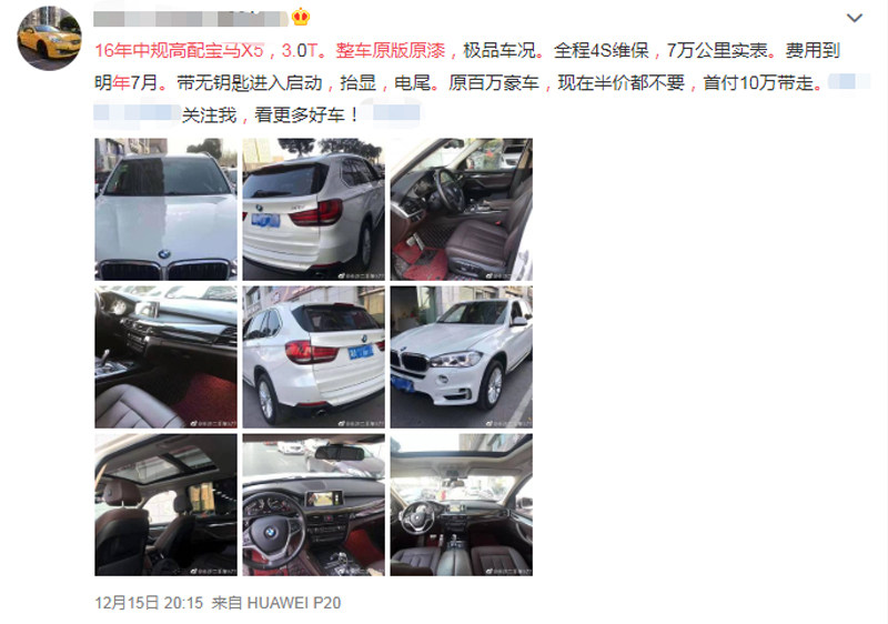 之所以要说X5车型,是因为教授最近在微博上,看到了一位二手车中间商频繁发布豪华SUV的二手车售卖信息,其中单单是关于宝马X5的二手车发布频率就每天高达数10次。可见这个中间商是有多着急将这辆宝马X5卖出去。