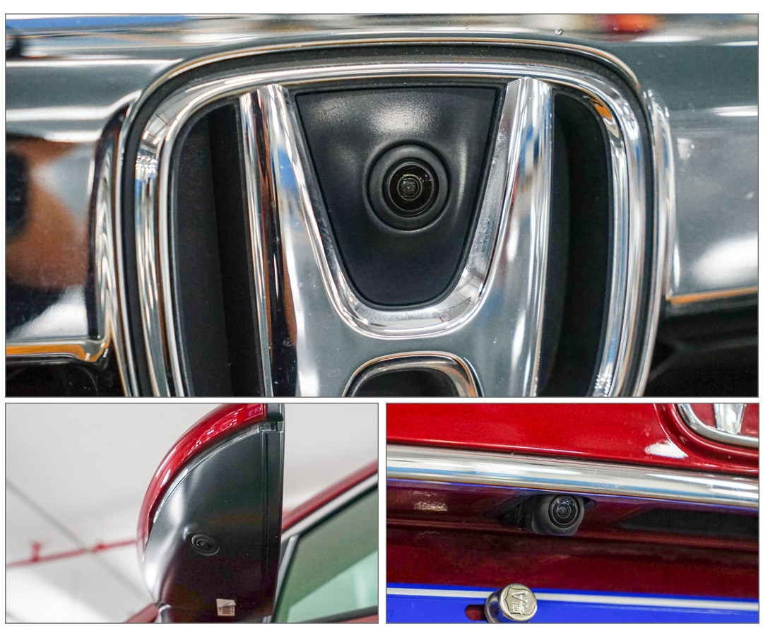 这种全景影像的工作原理其实很简单,在车辆的中网、左右后视镜、车尾各安装一个广角摄像头,摄像头拍摄到的画面交由电脑拼接,在中控屏上呈现出车辆俯视角的全景影像。