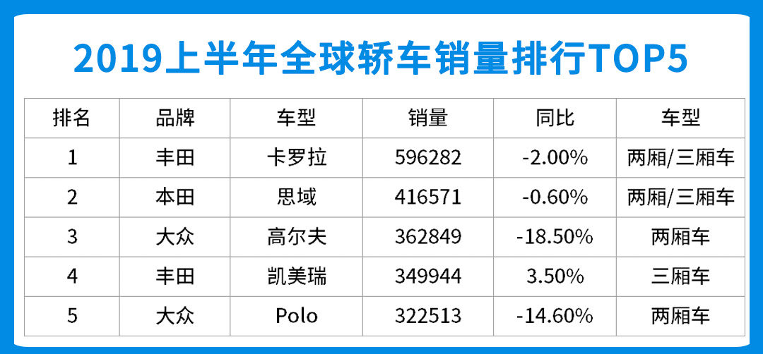 而与国内形成鲜明对比的是,两厢车在国外的异常火爆,在2019年上半年全球轿车销量TOP5榜单中,有四款是两厢车,其中卡罗拉、思域是两厢/三厢同时在售,POLO、高尔夫则是纯粹的两厢车。而在欧洲市场,以两厢车为主的A0级及以下车型的占比在2018年达到了42%,并且呈逐年上升的趋势。