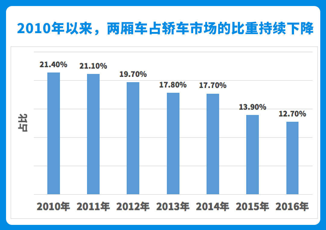 当然福克斯的下跌还与其所处的两厢车市场整体下滑有很大关系。根据乘联会的相关数据显示,国内两厢车的销量占比从2010年的21.4%下降到2016年的12.7%,而两厢车占据了福克斯很大一部分销售比重。
