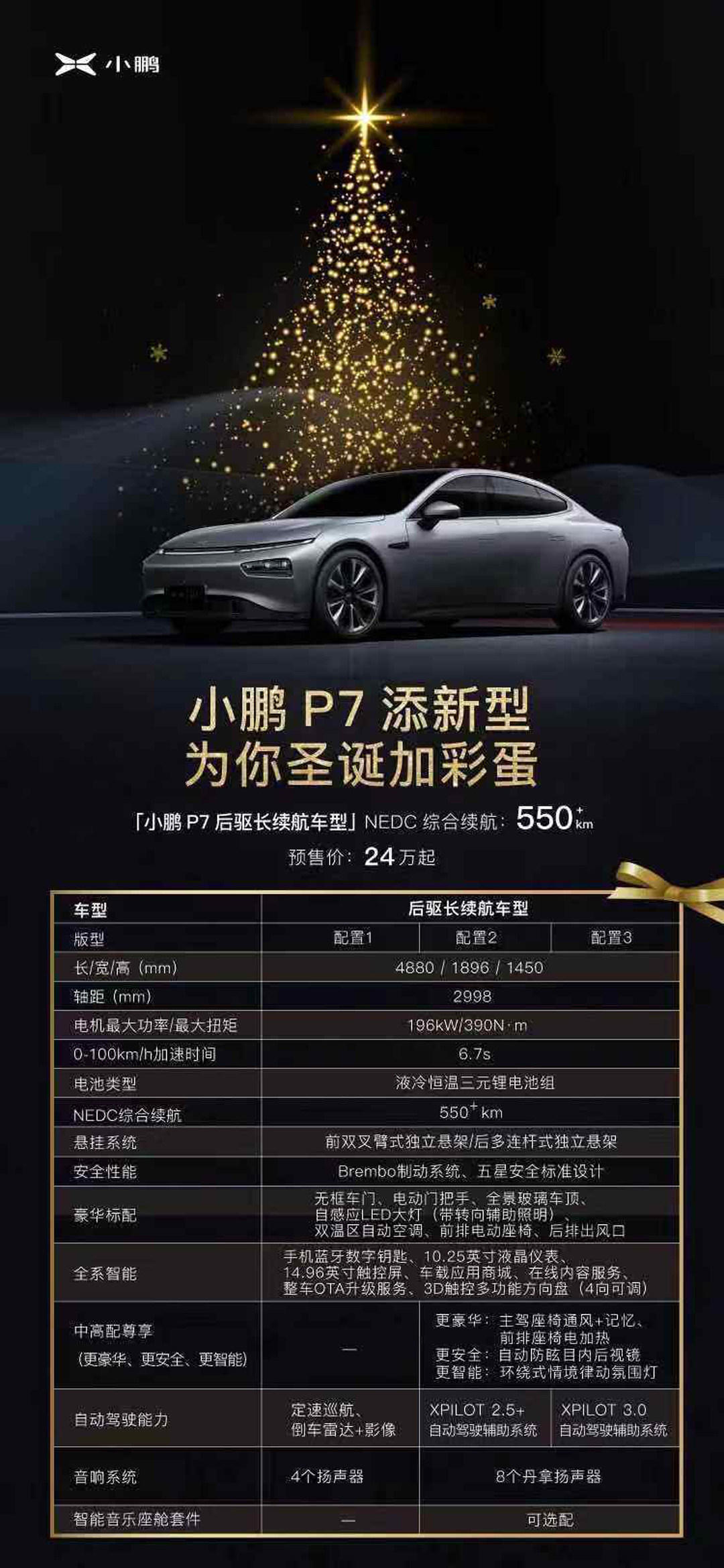 12月25日,小鹏P7后驱长续航版本正式发布并开启预售,预售价格24万元起。加之此前广州车展发布的高性能四驱版、后驱超长续航版,小鹏P7共提供3个车型、8个版本,预售价格区间也变为24万元-37万元。