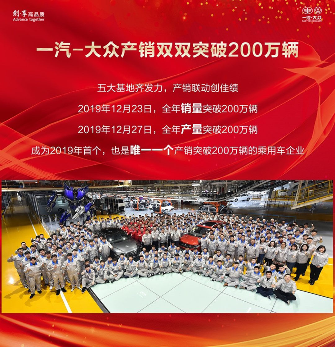 刚过了1号,一汽-大众就迫不及待地公布了自己的2019年“战绩”。从官方的数据来看,2019年一汽-大众成为国内第一家跨入年销量210万辆阵营的乘用车企业,当然这个成绩是包括了一汽-大众、一汽-大众奥迪和一汽-大众新成立的子品牌捷达。