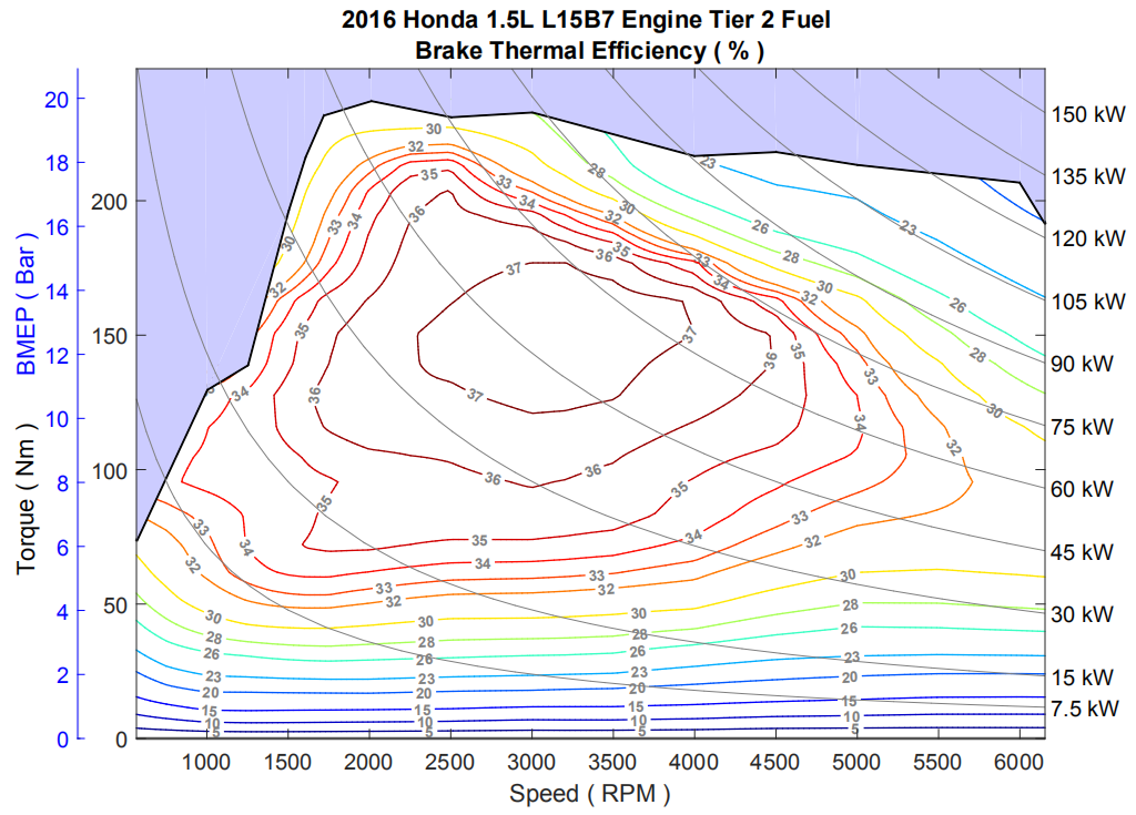 思域1.5T发动机,宣传最高热效率有38%,但它最常用到的效率区间也就是36%。为什么很难达到37-38%的效率区间?因为这个效率区间对应的功率太高了,一般高速120km/h以上才能用到。