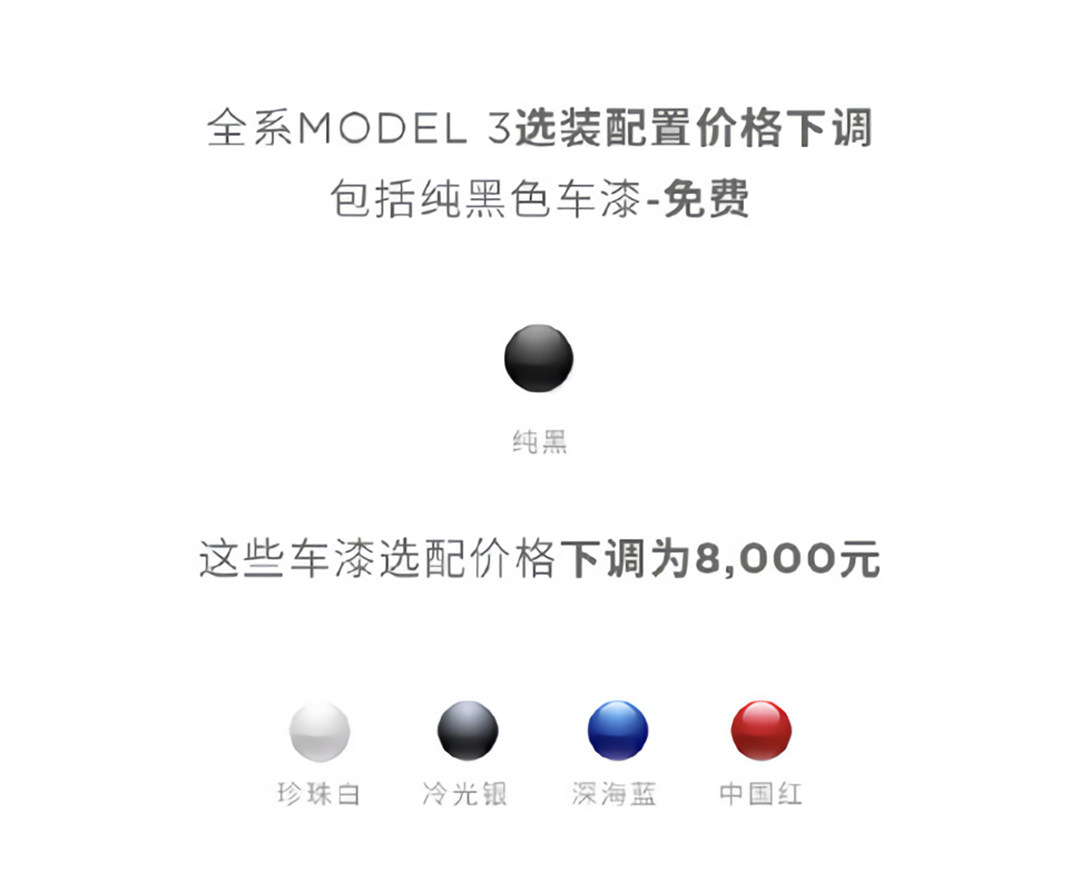另外,在选配上特斯拉方面也对价格进行了大幅度的调整。在车漆颜色方面,纯黑色车漆从9500元调整为免费提供,珍珠白、冷光银、深海蓝统一调整为8000元,而此前需要18900元的中国红车漆也下调至8000元。