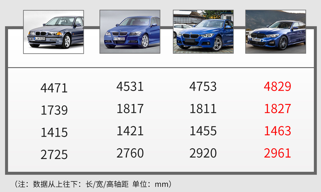 再来看看豪华车阵营,那现在“34C”之中尺寸最大的3系来说,2003年国产了第4代E46,到现在的第七代G20,车身长度从4471增加到现在的4829mm,轴距从2725mm增长到现在接近3米(长轴版),每一代都在增大。