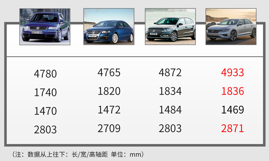 帕萨特算是伴随中国汽车市场成长的车型,回顾帕萨特的变化,尺寸也是非常明显的一代比一代大,销量亦然。帕萨特(Passat车系)从第5代于1996年国产,到现在第8代,其车身长度从4780mm米升级到现在4933mm,车身宽度也从1740mm增加到1836mm。