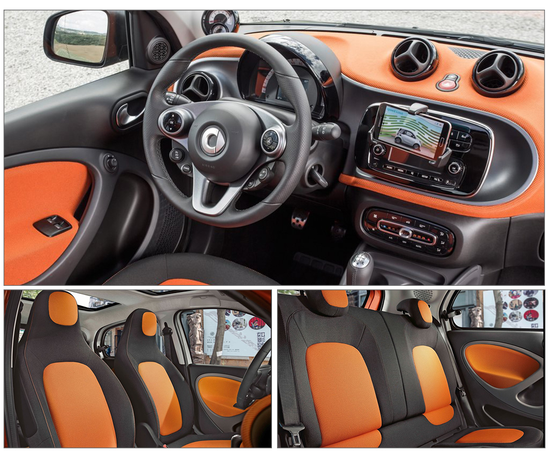 smart forfour延续了3门车型的内饰设计,并有双配色搭配;另外还有大量的圆造型元素,像多功能按键和空调出风口;整体上smart的内饰质感营造得很好,不会有廉价的感觉。而后排车窗虽然不能进行升降,但多出的两个座位才是考虑的重点。