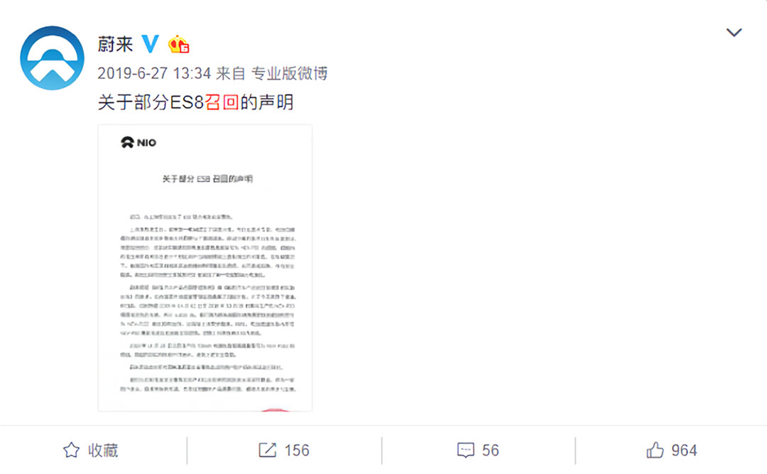 庆幸的是,蔚来官方针对自燃事件给出了回应,深入调查处理,同时防患于未然,于2019年6月27日申请召回了在2018年4月2日到2018年10月19日期间生产、销售的ES8车型,共计4803辆。