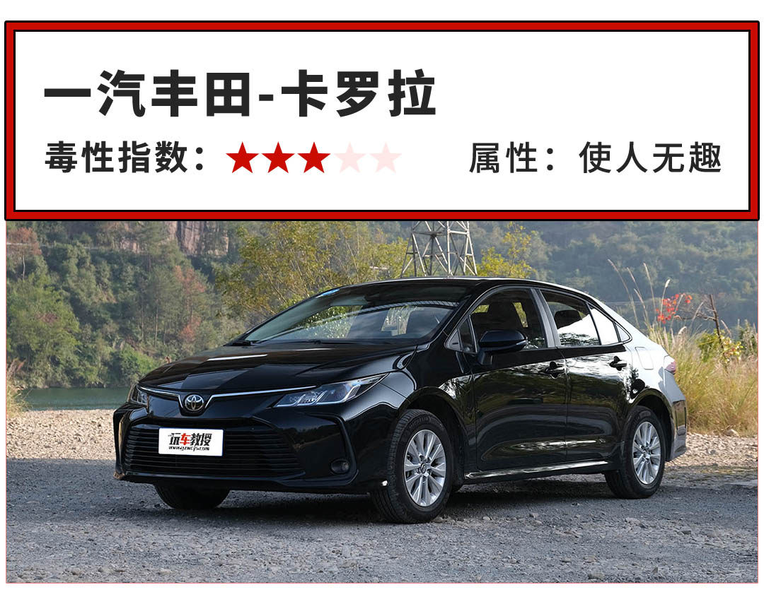 相对于思域来讲,丰田卡罗拉在外观上少了几分激情却多了几分耐看,内饰上少了几分粗糙多了几分紧致,动力上少了几分冲动却多了几分平稳,卡罗拉就是这么一款均衡的车型。除此之外,卡罗拉经过这么多年的经营,省心省事的口碑深入人心,不容易出问题也算是它的“毒性”之一,开上卡罗拉你就会觉得,这辆车只要开就行,什么都不用干(记得学会加玻璃水)。此时,你不得不感叹“这车真是有毒!”。