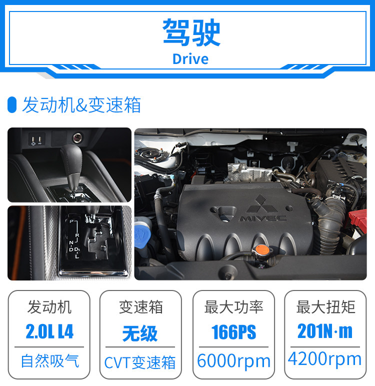 三菱劲炫ASX搭载1.6L和2.0L自然吸气发动机,这次测试的是2.0L+CVT的版本。这台2.0L的自然吸气发动机型号是4J11,搭载三菱的MIVEC可变气门控制系统,全铝缸体,主要升级点为国六排放。搭配的变速箱为第三代INVECS无级变速箱,整体的动力匹配是比较成熟可靠的。