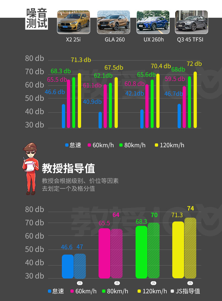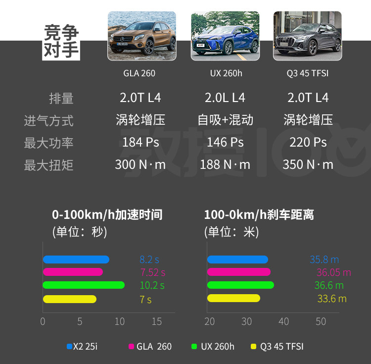 对比之下,其实官方成绩的X2基本跟能跟对手持平,动力和制动在同级别当中都处于上游,同样顶配动力跟GLA是差不多的;雷克萨斯家族车系的优势向来不在动力而在质感,所以加速稍弱;只怪Q3的表现优秀,换代后的Q3不容小觑。