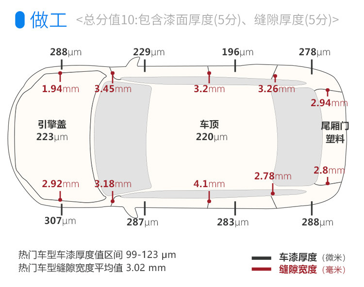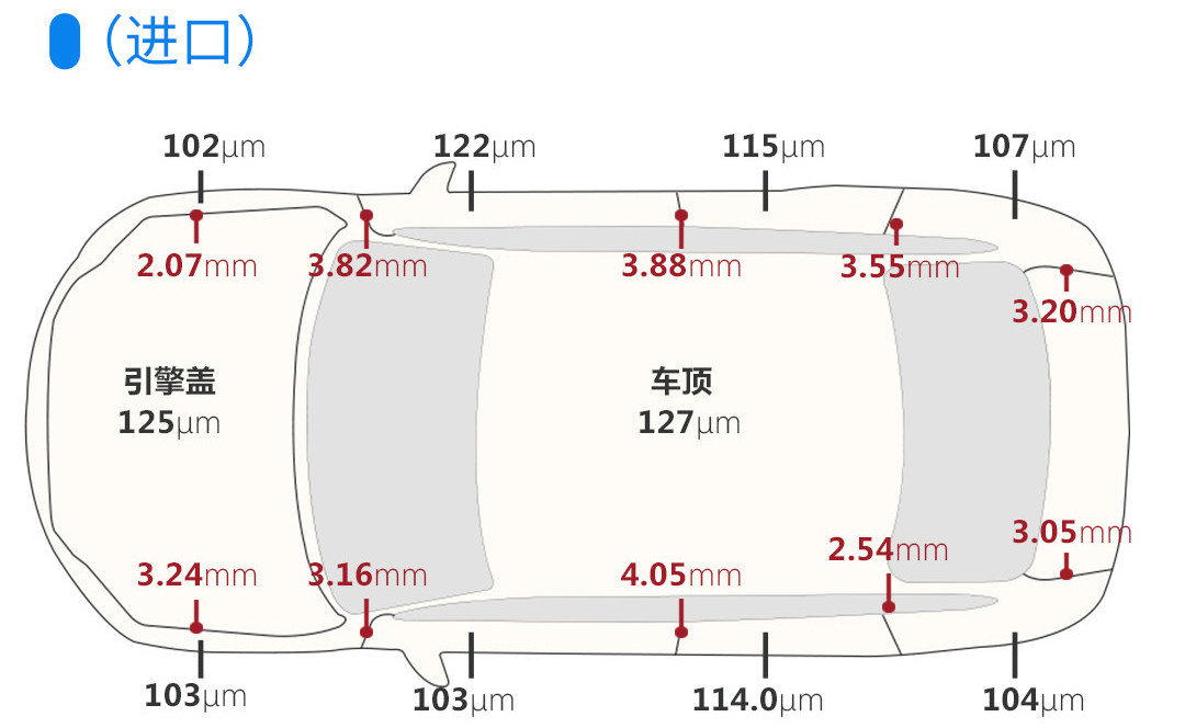 下图是进口的测量数据,对比之下,国产的漆面是更厚了,而且这个广告车色的色泽、光泽都相当棒,可以给到满分;而板件间隙也有所进步,整体都不错,但还不是特别均匀。