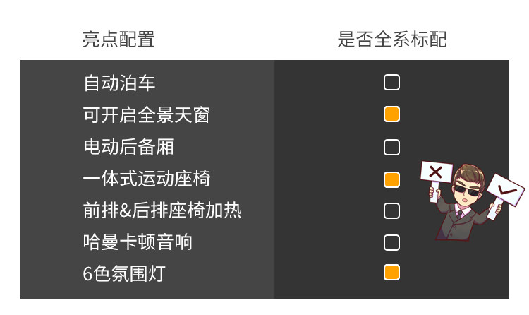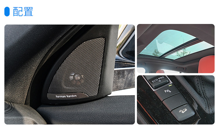 顶配车型车型配置相当丰富,哈曼卡顿音响、感应后备厢,全景天窗、前后排座椅加热;值得一说的是,自动泊车、电动+记忆后备厢、是最低配车型以上均有配备,基本上次低配就已经足够使用。