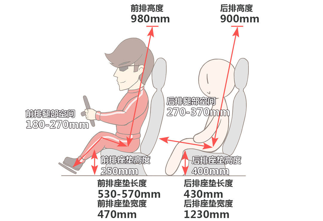 需要指出的是前排座椅的宽度不是很够,正常是50cm,47cm的坐垫宽度稍微胖一点的驾驶者坐的话,大腿和臀部会包裹不到位;后排的坐垫长度也偏短,只有43cm,对大腿的承托不到位,正常来说应该是50cm左右,当然这也的尺寸下也是情有可原。