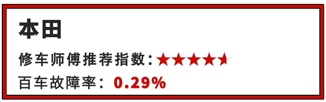 “一日本田终身本田”,虽然不完全对,但至少代表了大部分本田车主的心声。本田素有买发动机送车的称号,发动机不仅动力好、油耗低,而且低故障率是业界公认的。在英国ACE Limited的调研中,每344辆车才会出现1辆发动机故障,发动机百车故障率仅为0.29%。