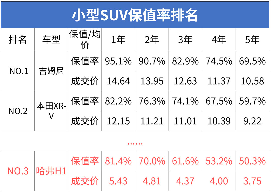 哈弗H1的保值率在XR-V之下,缤智之上,着实让人大吃一惊,5年过后残值剩余50.3%,国产车中很少有车型能够做到。哈弗H1又是怎么做到的呢?大家看价格就知道了,这款车在未停售时指导价为5.49万-7.39万,这么低的价格也就意味着它二手车的价格波动不会很大。不过这么低价位的国产车,就哈弗H1脱颖而出了,还是值得推敲的。