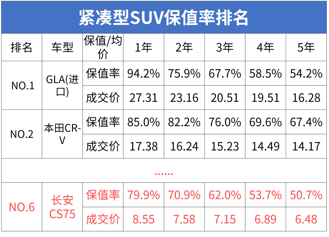 紧凑型SUV保值率前十中居然没有哈弗H6倒是很让人意外,不过一直与H6打擂台的长安CS75上榜了,位列第六。5年过后还有50.7%的保值率也是在国产车中独树一帜,试想一下,5年过后,这款车还有6.4万的残值,令车主很是满意。