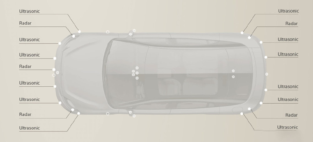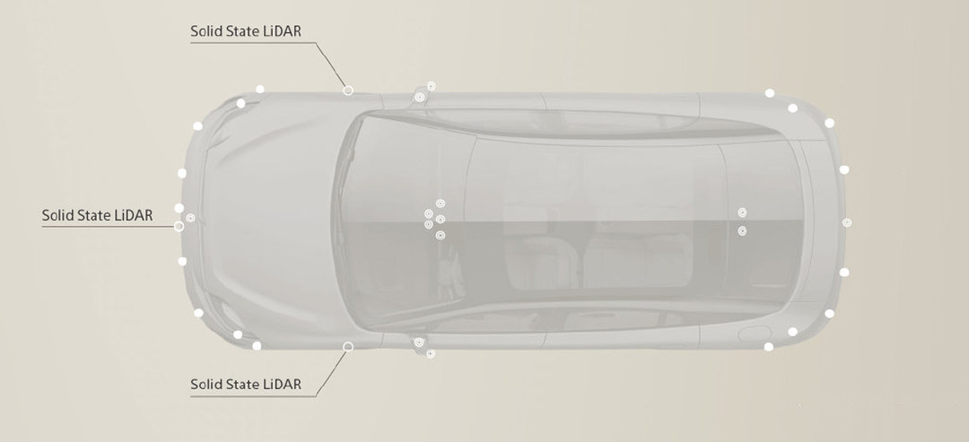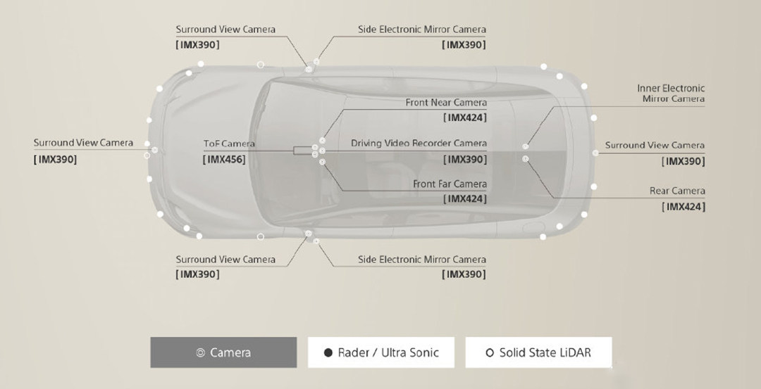 在Vision-S概念车上,一共搭载了33颗传感器,其中摄像头12颗、超声波雷达12个、毫米波雷达5个、激光雷达3个。车头、车侧以及车尾等处都有IMX390型号的环视摄像头,前挡风玻璃和车尾等处有IMX424型号的摄像头,整车被CMOS跟ToF在内的33个传感器所包裹,其规格之高,可以做到360度无死角的监测跟感应。