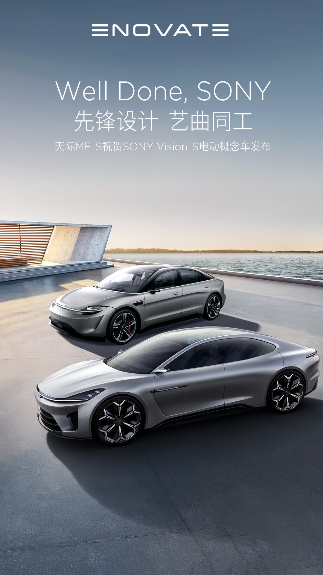 凑巧的是就在索尼发布了Vision-S概念车之后,天际汽车也发布了一张海报,并将自家的ME-S概念车跟索尼Vision-S概念车并排展示。如果将两车一同对比,那么其相似之处可不少,分层的车头设计、一体式前LED车头灯带、电子外后视镜、双腰线设计等等细节怎么看都像是“一家人”。另外,在天际ME7车内就使用了前3+后2的5块大尺寸液晶屏,索尼Vision-S整个内饰的氛围也跟天际汽车颇为相似。
