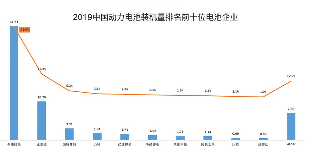 根据最新发布的2019年动力电池装机数据显示,2019年,中国动力电池装机量达到62.2GWh,同比增长9.2%。其中,宁德时代一家的装机量就高达31.71GWh,占据全年动力电池装机量的51%,独占鳌头。