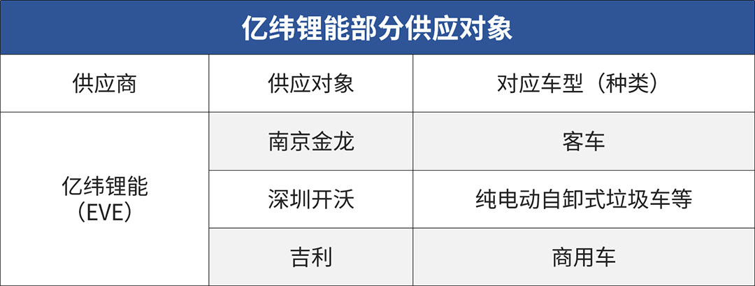 不同于前面四家企业,亿纬锂能主要是为客车提供电池服务,是南京金龙第一大供应商。另外,在专用车领域,它除为南京金龙提供电池服务外,还为吉利商用车、东风汽车、深圳开沃提供电池,而深圳开沃是其第一大收入来源。