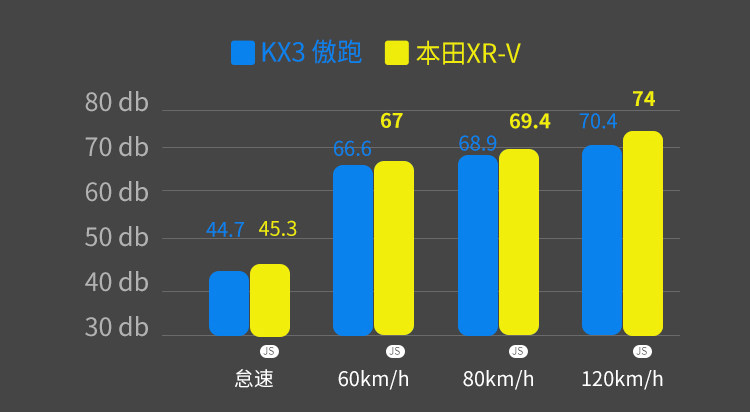 在怠速情况下就比XR-V低接近2个分贝,中高速情况下XR-V发动机不急加速时两者差不多,但全新一代傲跑还是比XR-V低1个分贝左右,而在120km/h巡航情况下,XR-V的数据在该级别当中算是不错的水平了,而KX3傲跑可以低至70分贝,这个数据比一些入门的豪华车都要低!