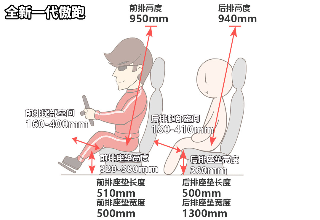 在调整好前排坐姿保持不变的情况下:全新一代傲跑的后排腿部空间有3拳左右;后窗开口很大,后面还有一个三角窗,全景天窗能到头顶位置,开阳感十分出色;坐垫高度很充足,腿部承托到位。