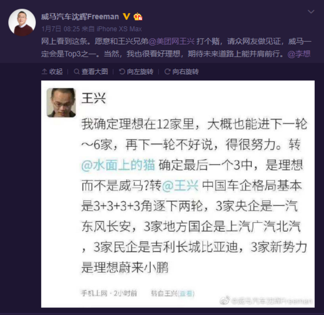 在2020年1月初,美团的创始人王兴突然发表评论称,未来能够留下的3家造车新势力是理想、蔚来、小鹏。威马的创始人兼CEO沈晖得知消息后与王兴打了一个赌,“如果威马汽车能挺进造车新势力TOP3,我希望王兴能(充当外卖小哥)亲自给我送一份外卖上门;相反,王兴可以在所有品牌中随便挑一辆车,不管多贵我买一辆送给他,不一定非得是一辆威马汽车。”