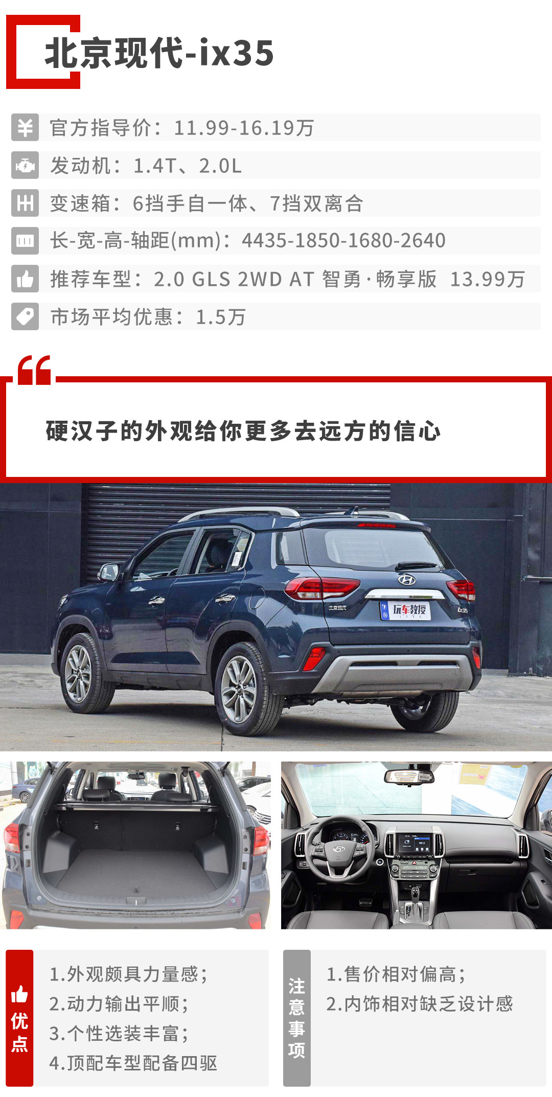 撇除一些非常热门的日系品牌,其实韩系品牌还是有着不错的选择,来自现代的Ix35就是其中之一。在外观上ix35的设计还是颇为硬朗的,整体的车身线条让其看起来充满肌肉感,车顶的行李架略添几分霸气。