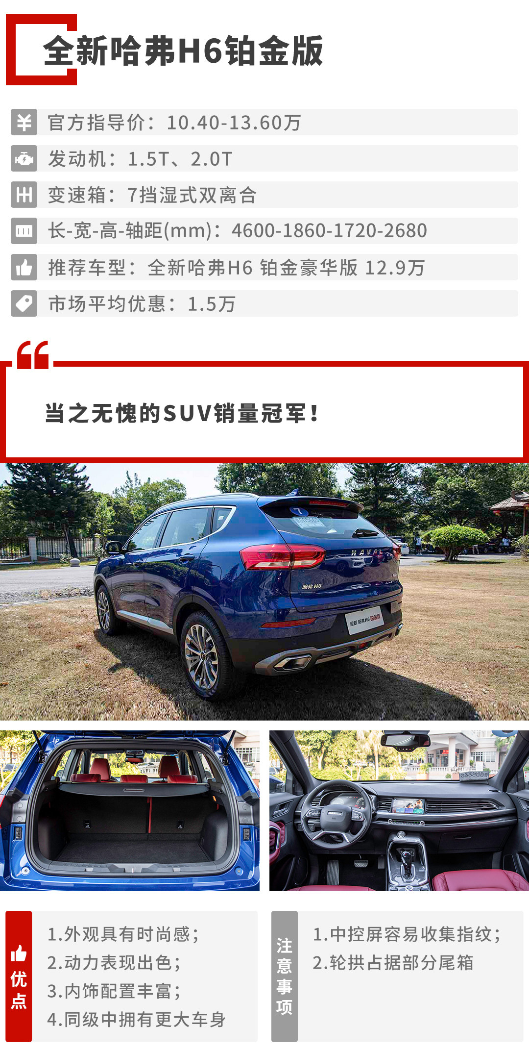 全新哈弗H6铂金版车型相比同价位车型拥有更大的车身尺寸,这让其在后排空间上拥有更好的表现。至于在动力上全新哈弗H6铂金版提供1.5T和2.0T两款动力可选,1.5T能满足大多数人的用车需求,但如果对动力有追求那么2.0T车型将会是个更好的选择。