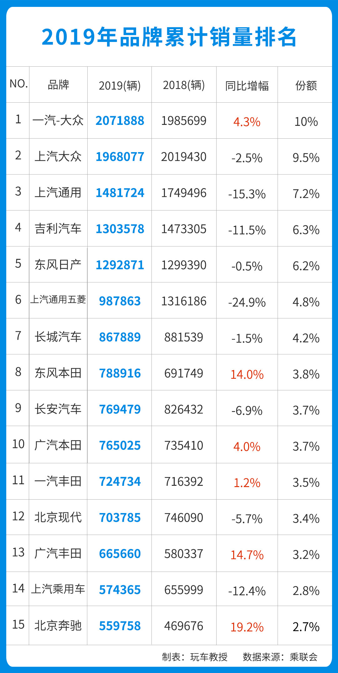 乘联会12月份销量数据出炉:12月狭义乘用车零售销量达214.1万辆,同比下降3.4%,环比增长11.1%。随之而来的是汽车品牌全年销量数据,据乘联会统计,2019年我国全年累计汽车销量达2069.8万辆,同比下降7.4%。