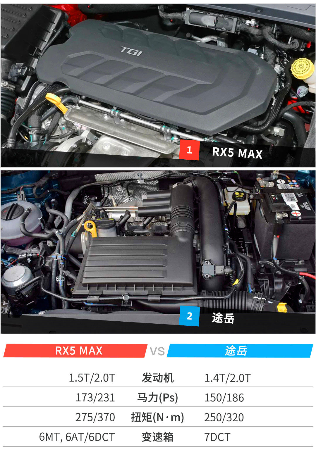 在动力总成方面,荣威RX5 MAX也体现了自主品牌田忌赛马竞争策略,那就是在相近或相同排量下,自主品牌车型的引擎动力往往要比合资品牌更强,并且从价格上看,合资品牌低规格动力款式的价钱,通常都已经能买到自主品牌高规格动力的款式。比如RX5 MAX的2.0T顶配也才18万多,跟途岳1.4T次顶配一个价,而如果你想买途岳的2.0T款式,就得花超过20万了。