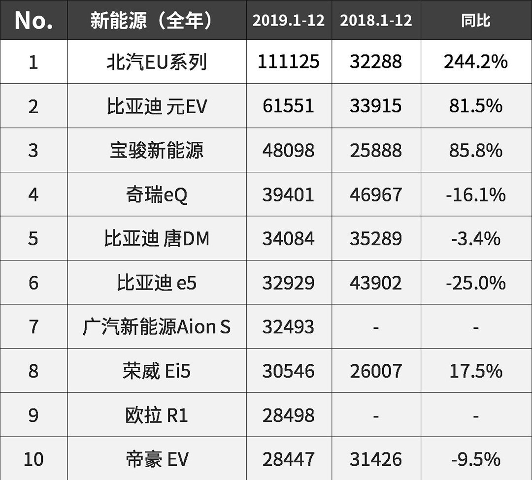 回到表格,可以看见北汽EU系列以恐怖的11.1万辆高居榜首,同比上年增长达244.2%,不过由于是EU系列多车型合计,所以数据略显夸张。但在产品硬实力方面,北汽EU系列确实做到了耐用、实惠、续航高,这也使得很多网约车司机购入使用。