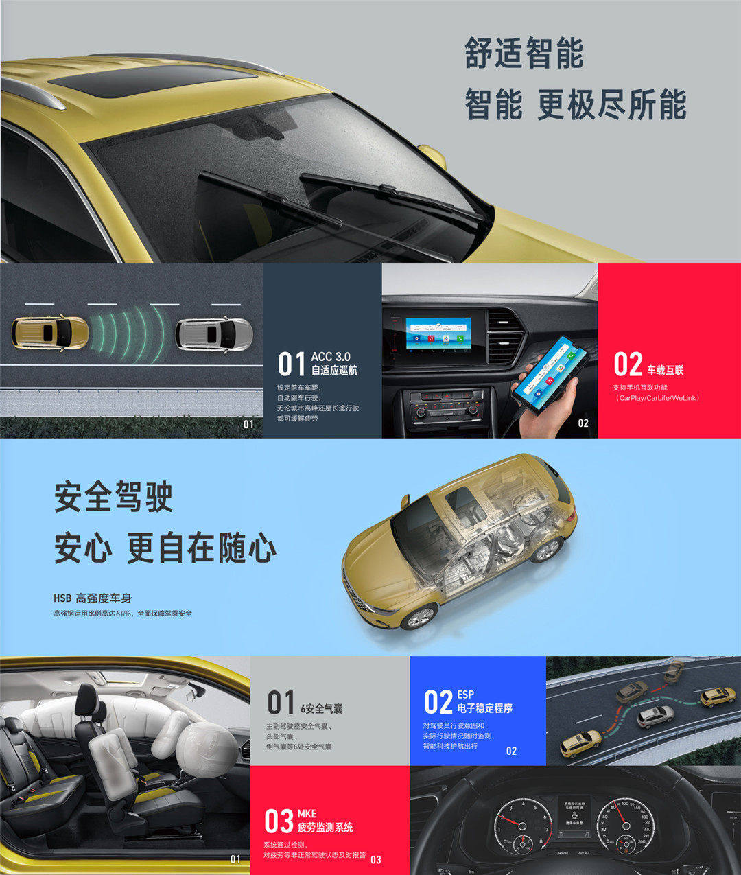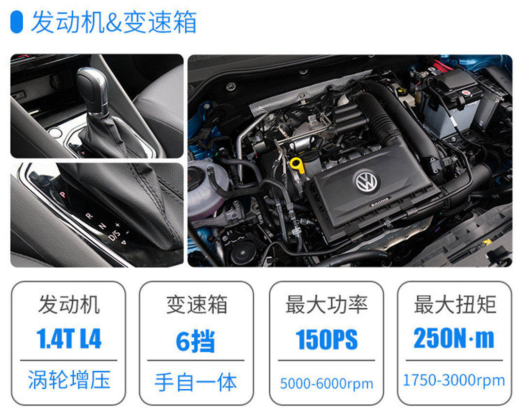 全系配备1.4T(EA211)(150马力、250牛.米),配备日本爱信6AT或大众5MT变速箱,动力总成成熟。出自大众MQB平台,前麦弗逊后多连杆独立悬架,全系标配定速巡航系统,全系配备LED大灯,夜间照明效果较好。