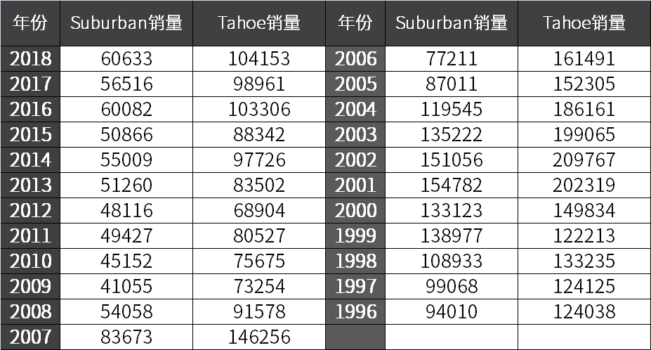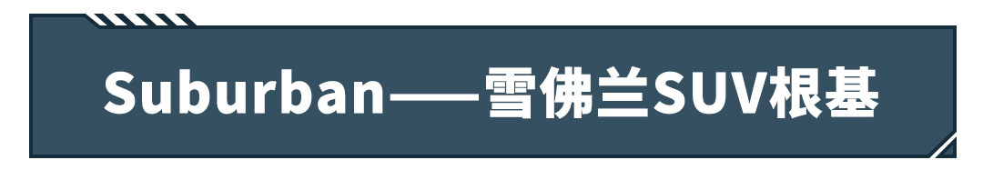 Suburban(民间叫法萨博班)和Tahoe(没有民间叫法),Tahoe是Suburban的姊妹车型,主要体现在C柱后面的部分,Tahoe的尾厢更短,Suburban是雪佛兰品牌的第一款SUV,也是最大的SUV,同时也是最重要的SUV,Suburban 在1933年就有第一代车型,至今已经八十多年历史,对雪佛兰品牌、美国市场、美国文化都有这很重要的地位。