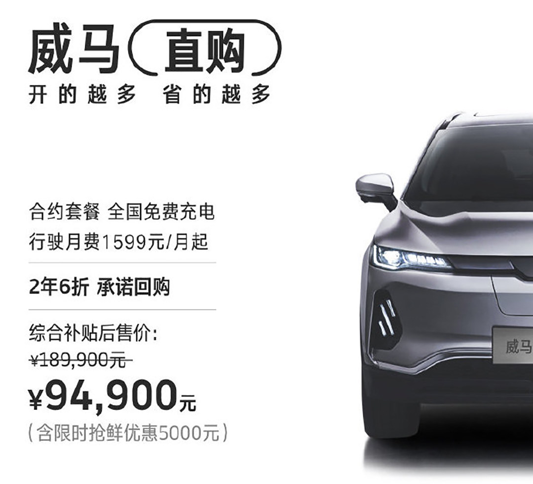 不过,参与“威马直购”活动的EX6 Plus为400 轻享版,NEDC续航里程为400km,该车补贴后官方指导价为18.99万元。在包含了限时抢购优惠5000元的前提下,裸车9.49万元即可将车提走(不含电池)。