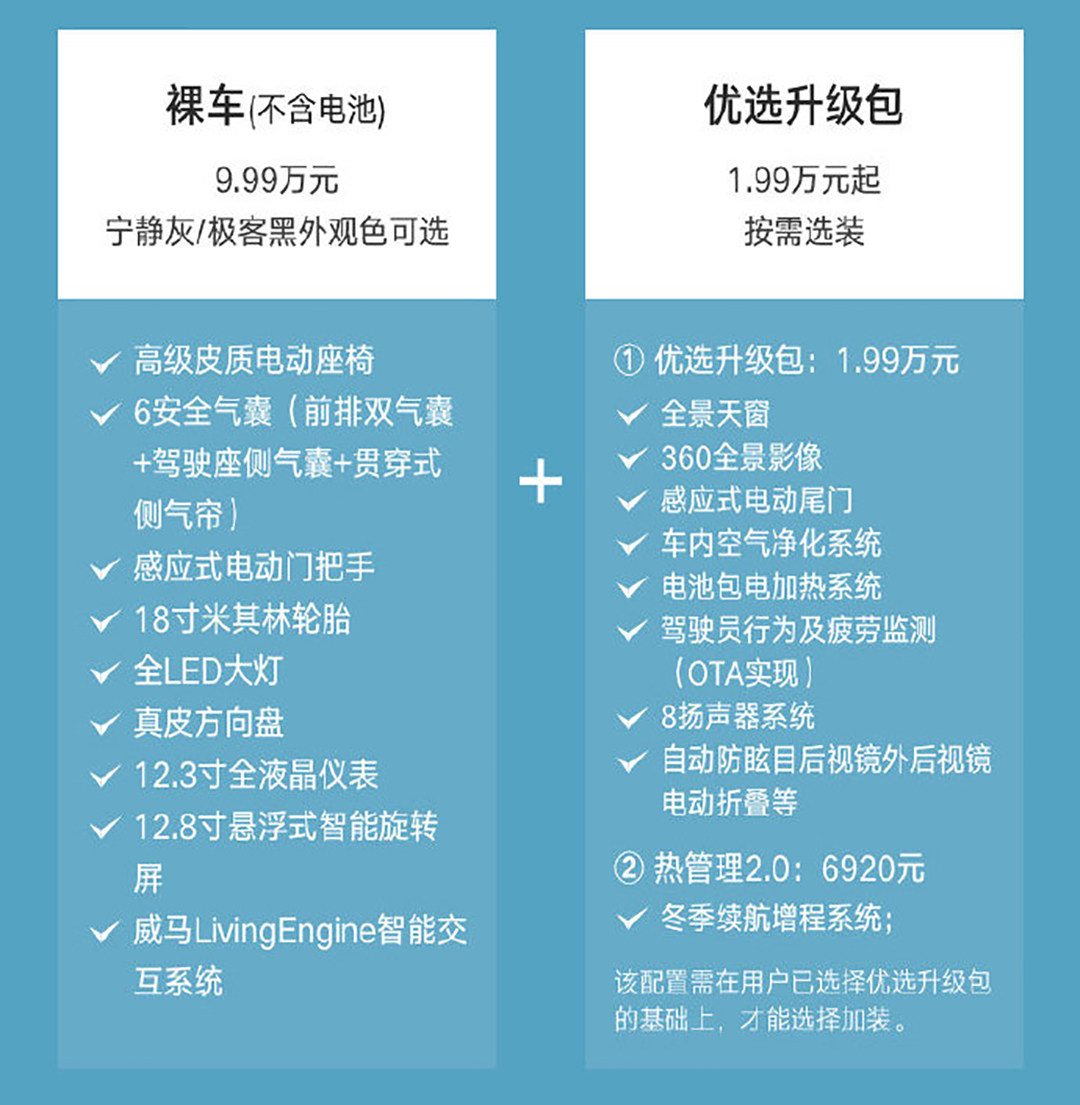 行驶月费套餐就好比电池租用方案,每个月给予固定的租用费用,按期付款即可。而威马的行驶月费套餐针对不同需求的用户,提供了2种不同的套餐的选择。