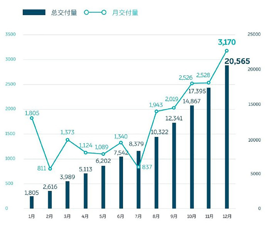 2019年全年,蔚来累计交付新车达到20565台,同比增长了81%;在2019年最后一个月,环比增长了25%,交付车辆达到3170台,创下全年新高,连续5个月打破销量记录。