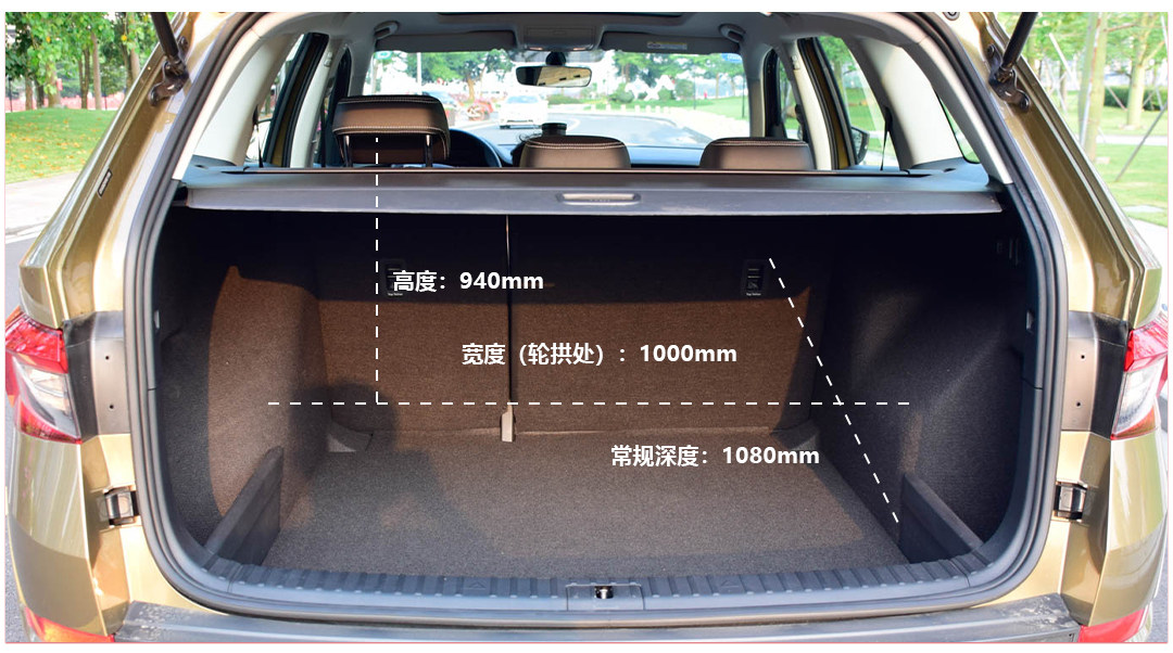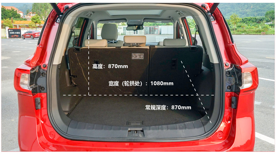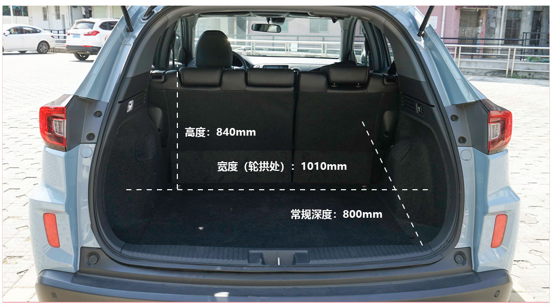 由于汽车尾厢并不是一个规整的空间,教授在此对尾厢空间部分选择了在不放倒后排座椅,不影响车内乘坐空间的情况下,以车型尾厢标准深度、高度以及宽度计算出可放置的单个大型物件体积(升)为标准。