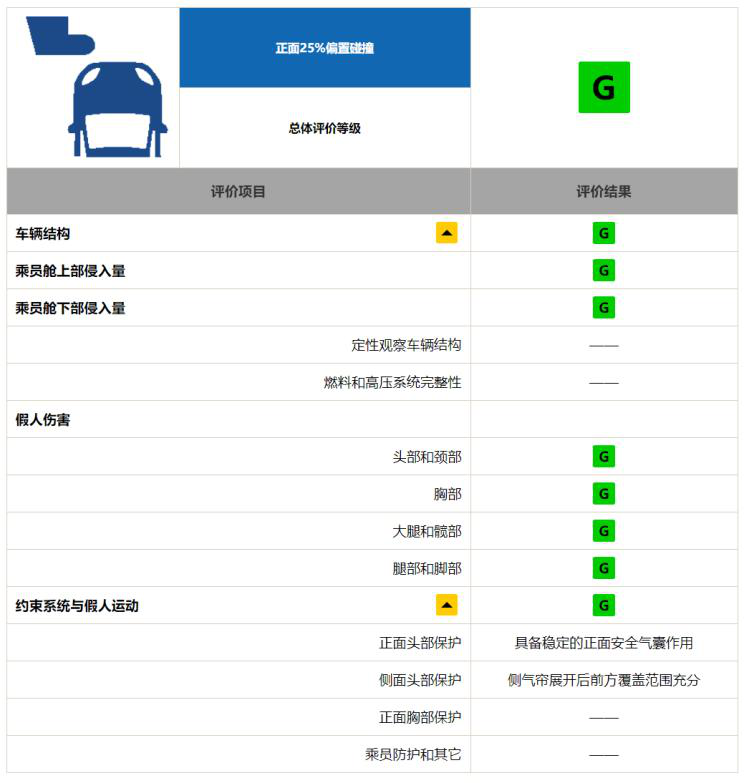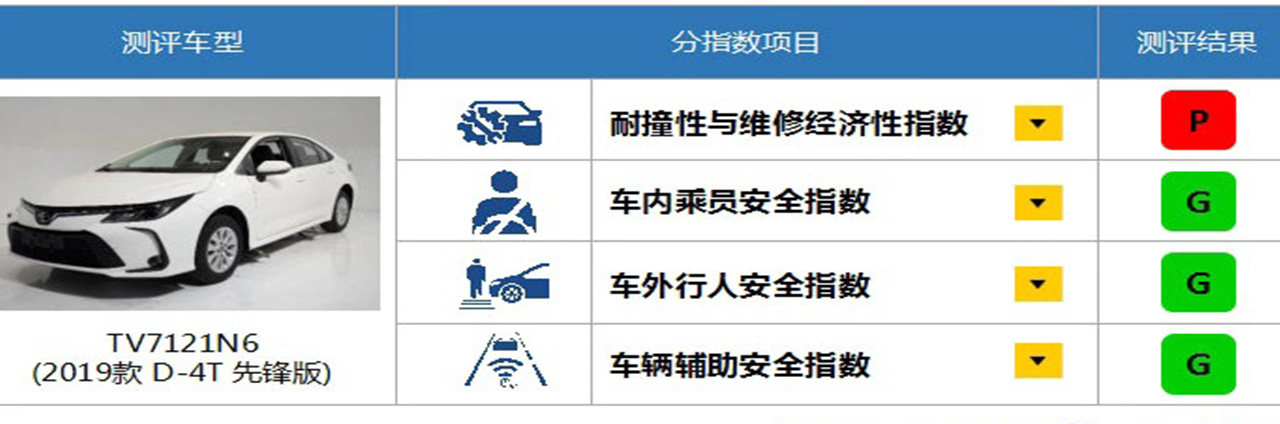 1月20日,中保研官方宣布完成了丰田卡罗拉车型的全部测试评价工作,并公布了测试评价结果。本次用于测试的车型是2019款1.2T 先锋版,本车型配备了主/副驾正面气囊、前排侧气囊、前/后排侧气帘、膝部气囊等配置,而碰撞结果显示:除了在“耐撞性与维修经济性指数”这一项获得差评(P),全新卡罗拉在其余项目上均拿到了优秀(G)的成绩,其中包括25%小面积偏置碰撞、侧面碰撞、行人保护、自动刹车系统等细化测试。而得到差评(P)的一项测试,是对低速碰撞下车辆维修费用经济性的考核点;此外,消费者非常关心的正面25%偏置碰撞中卡罗拉车型拿到了优秀(G)的评分。(图片源于中保研官方微博)