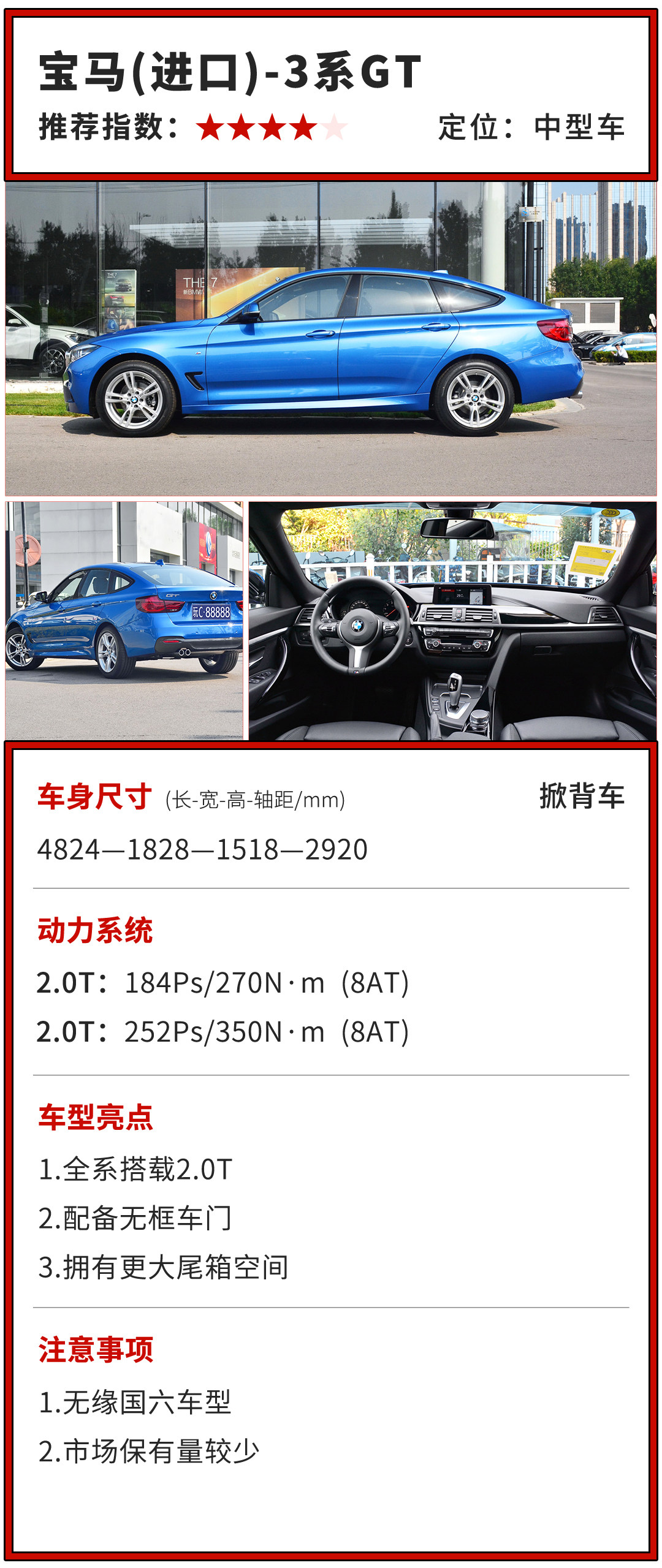 接着要说的是刚宣布要停产的宝马3系GT,外观上从前脸来看的话,该车与3系并没有区别,但是当你从侧面去看的话,你会发现该车与3系原来大有不同,溜背式的造型让该车看起来增添了不少运动感,并且在尾门上还带有自动升降的尾翼,而当你打开车门的时候又会发现无框车门的存在,每一处细节都在说明着与3系的不同。此外,由于采用了掀背式的造型设计,3系GT在尾箱空间上相比3系更有优势,对于喜欢自驾游的人来说简直就是一大福利。