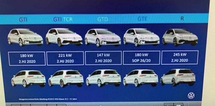 近日关于第八代高尔夫衍生车型、动力信息的图片被曝光,图中共有5款新车,包括了GTI、GTD、GTE、R以及GTI TCR,在生产时间方面,率先生产的是GTE,在今年6月22日开始,其余车型则是在2020年下半年开始生产。入门性能版的GTI、GTD和插混车型GTE,在前脸方面均采用了类似的包围设计,而进阶性能版的GTI TCR 和 R版则是配备了独特的前杠,两侧雾灯被取消,猜测是为了拥有更好的进气效果。在动力方面,我们熟悉的GTI版本为180kW,比现款的162kW有所提升,而作为最顶级的高尔夫R,最大功率为245kW,即333马力,而现款仅是290马力。