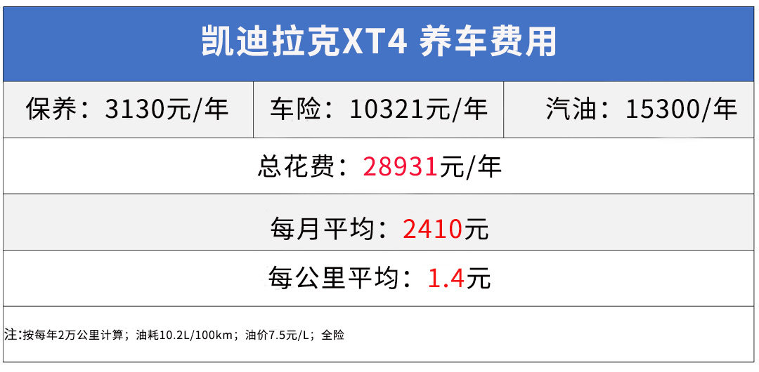 因为动力强,相应的XT4的油耗也就比较高了,不过10.2L/100km的平均油耗符合2.0T发动机应有的表现。而且XT4 每年3130元的保养费用不及奥迪和奔驰贵,从这里就抵消了油费的增加。