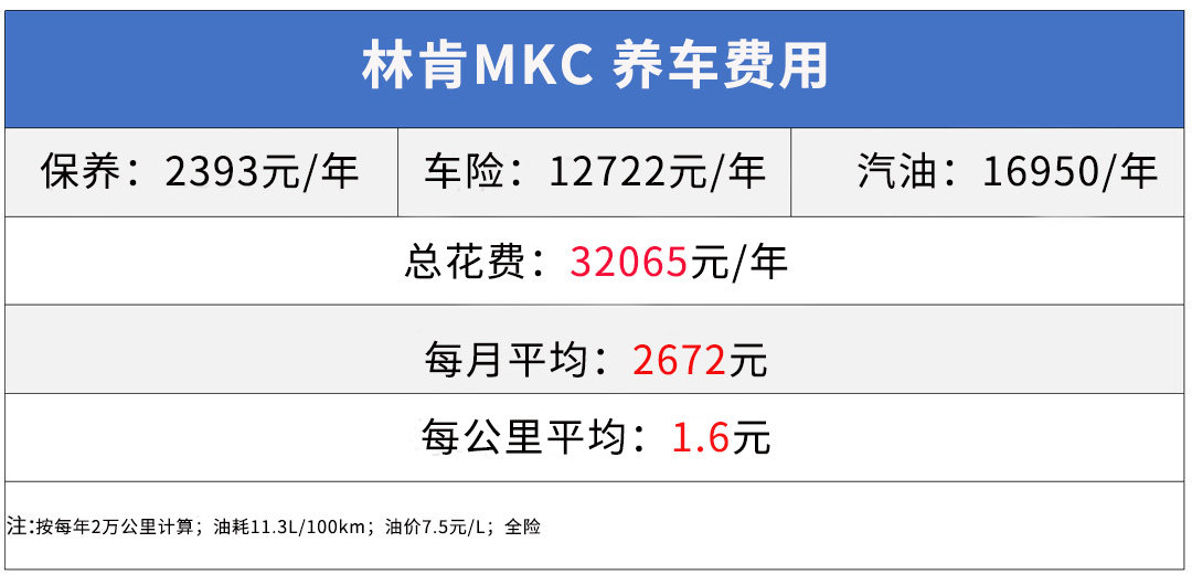 林肯MKC养车费用的大头是油费,毕竟11.3L/100km的平均油耗已经算比较高了,不过是因为这辆车的底盘比较厚重,获得了平稳的行驶质感,牺牲掉油耗也没什么。林肯MKC每个月的平均养车费用为2672元,在奔驰C级和奥迪A4L之间,还是可以接受的。